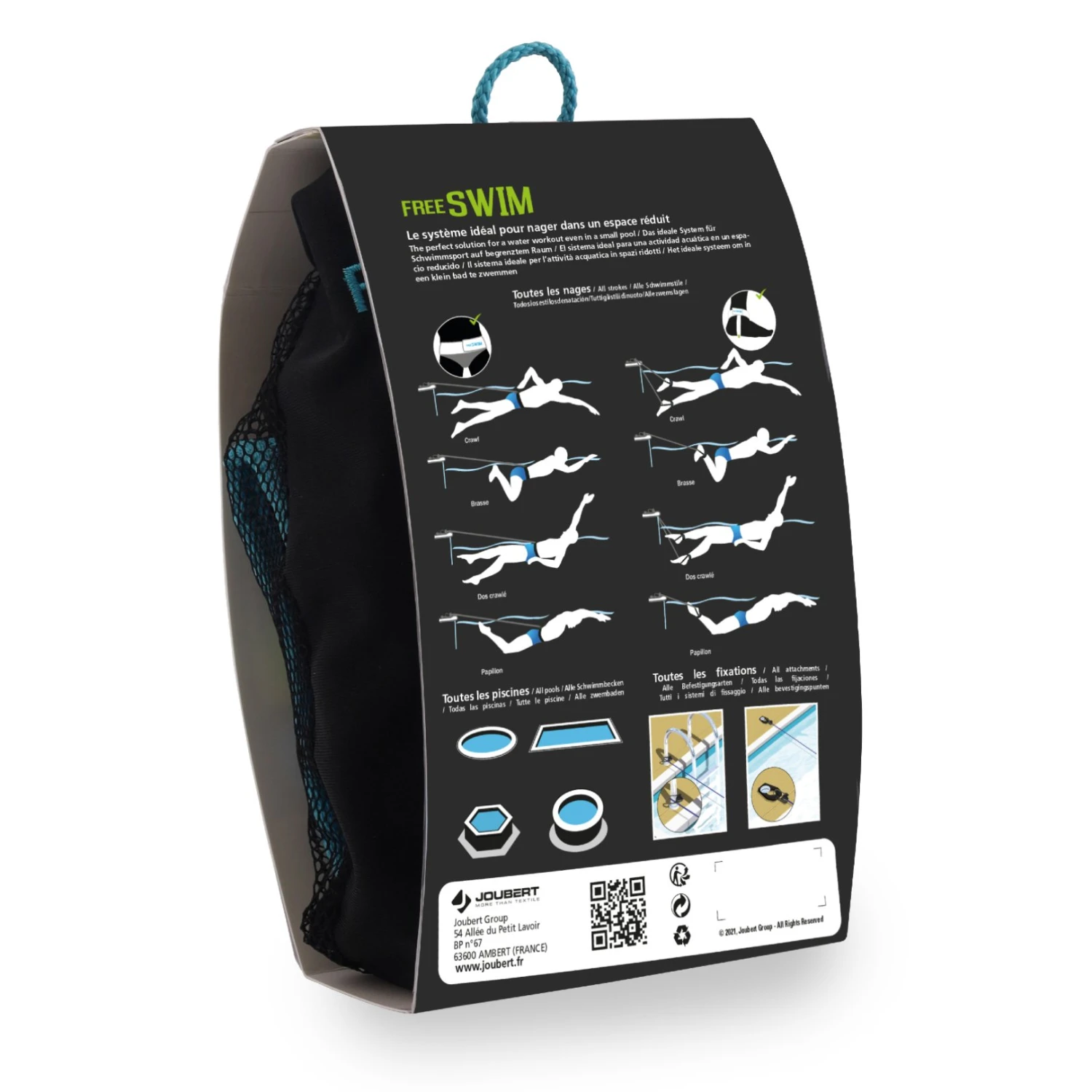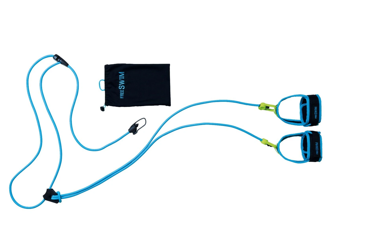 Zwemmen voor plezier of training, maar ook wandelen in het water of aquafitness doen. Nu is dit mogelijk met het nieuwe Free Swim systeem. Free Swim is een systeem om ter plekke te zwemmen tegen de weerstand van een elastiekje. Samengesteld uit een neopreen riem (tailleomvang 70-105 cm) en een klikbungee koord (lengte 200 cm), is Free Swim het ideale systeem voor een wateractiviteit in een kleine ruimte.