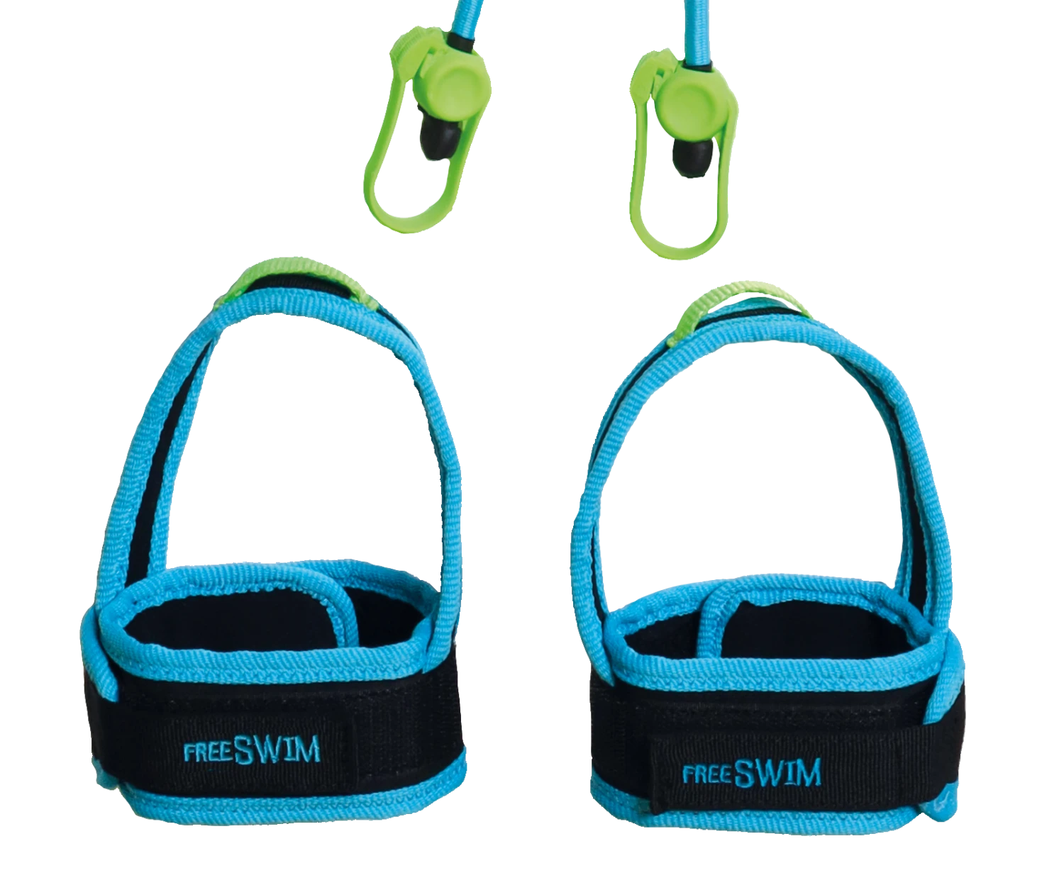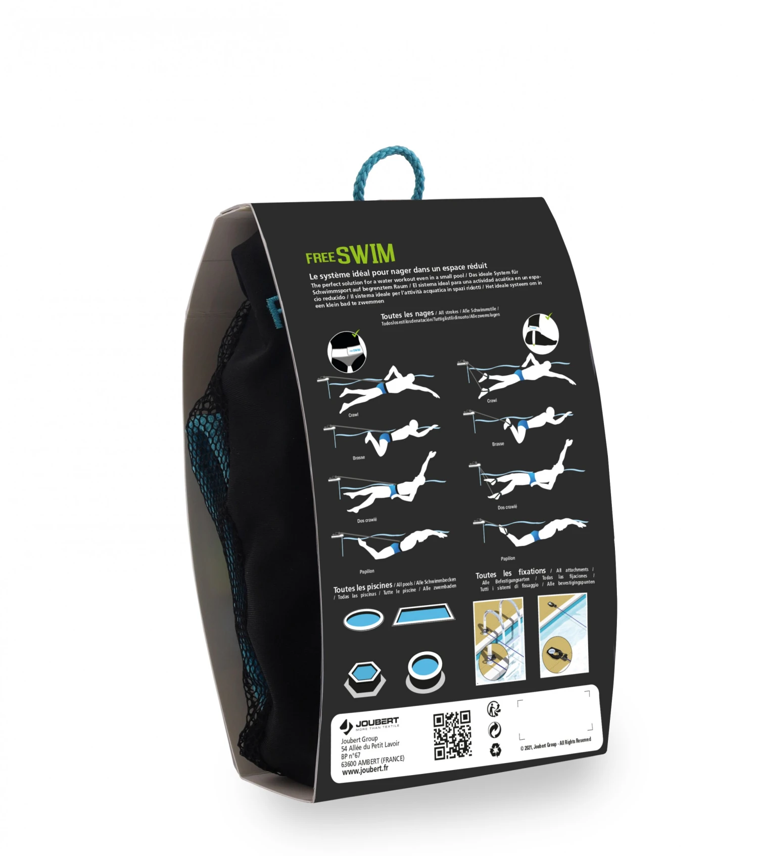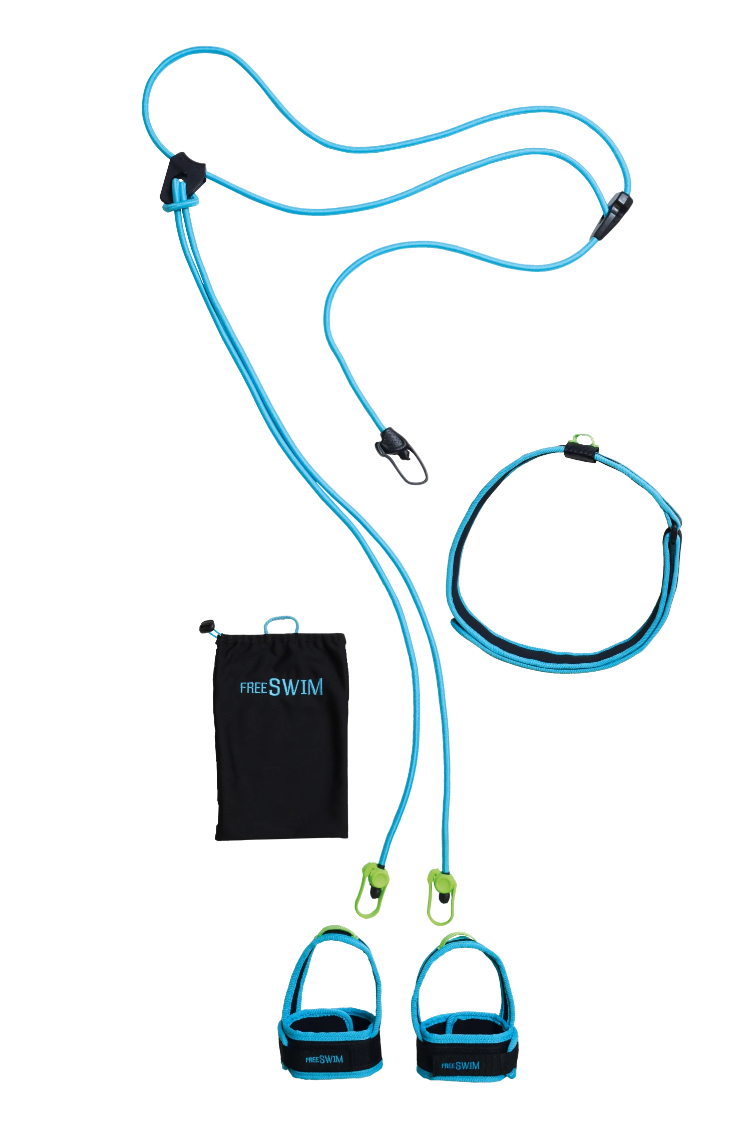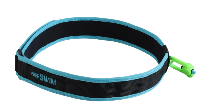 Zwemmen voor plezier of training, maar ook wandelen in het water of aqua fitness doen. Nu is dit mogelijk met het nieuwe Free Swim systeem. Free Swim is een systeem om ter plekke te zwemmen tegen de weerstand van een elastiekje. Samengesteld uit een neopreen riem (taille omvang 70-105 cm) en een klikbungee koord (lengte 200 cm), is Free Swim het ideale systeem voor een wateractiviteit in een kleine ruimte.