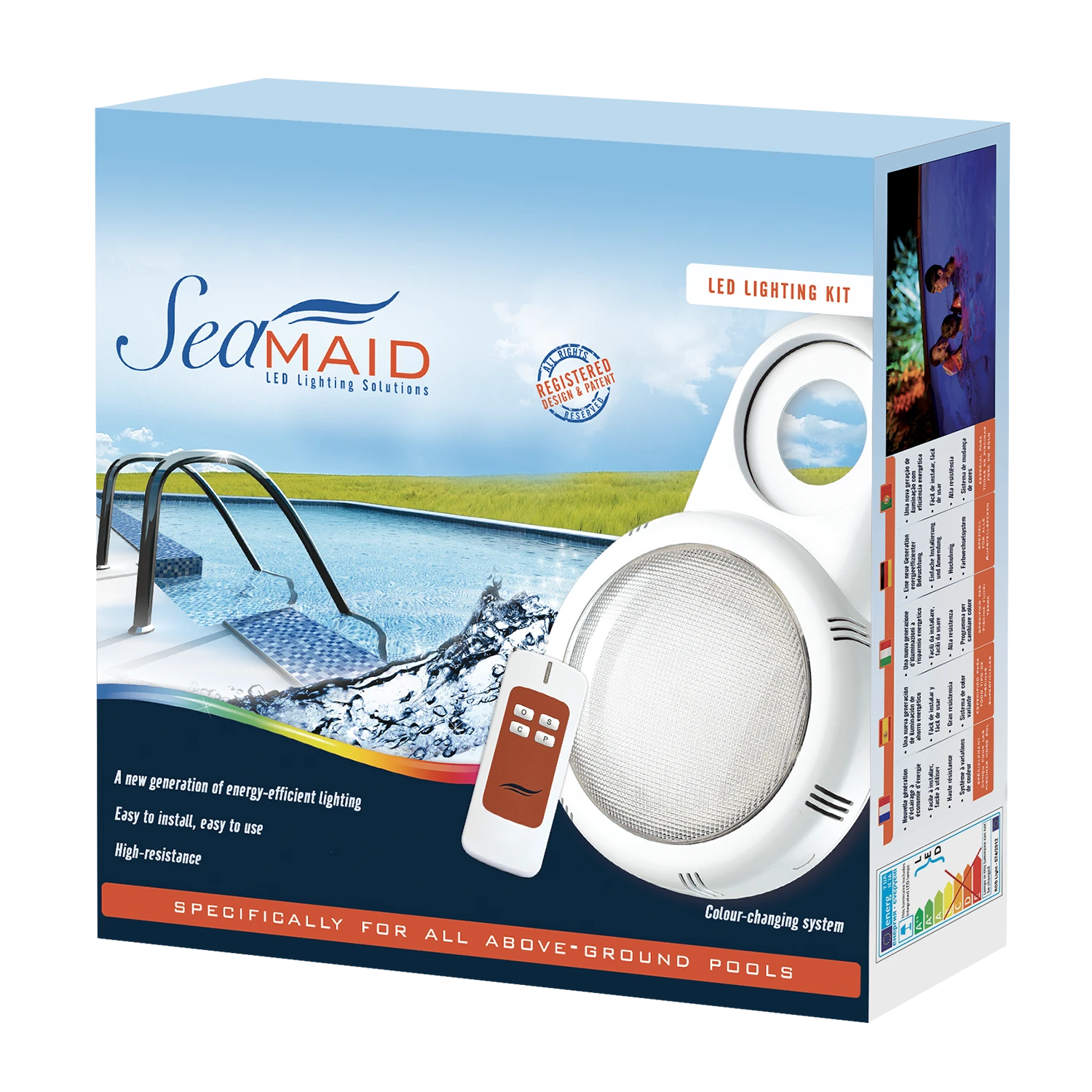 Verlichtingskit van SeaMAID. Verlicht uw zwembad met de eenvoudig te installeren spot van SeaMAID. Met geleverde afstandbediening kiest u tussen 7 vaste kleuren en 3 automatische sferen. Homogene en lichtverspreiding die niet verblindt – veilig voor de zwemmers. Inclusief Nederlandstalige gebruiksaanwijzing.