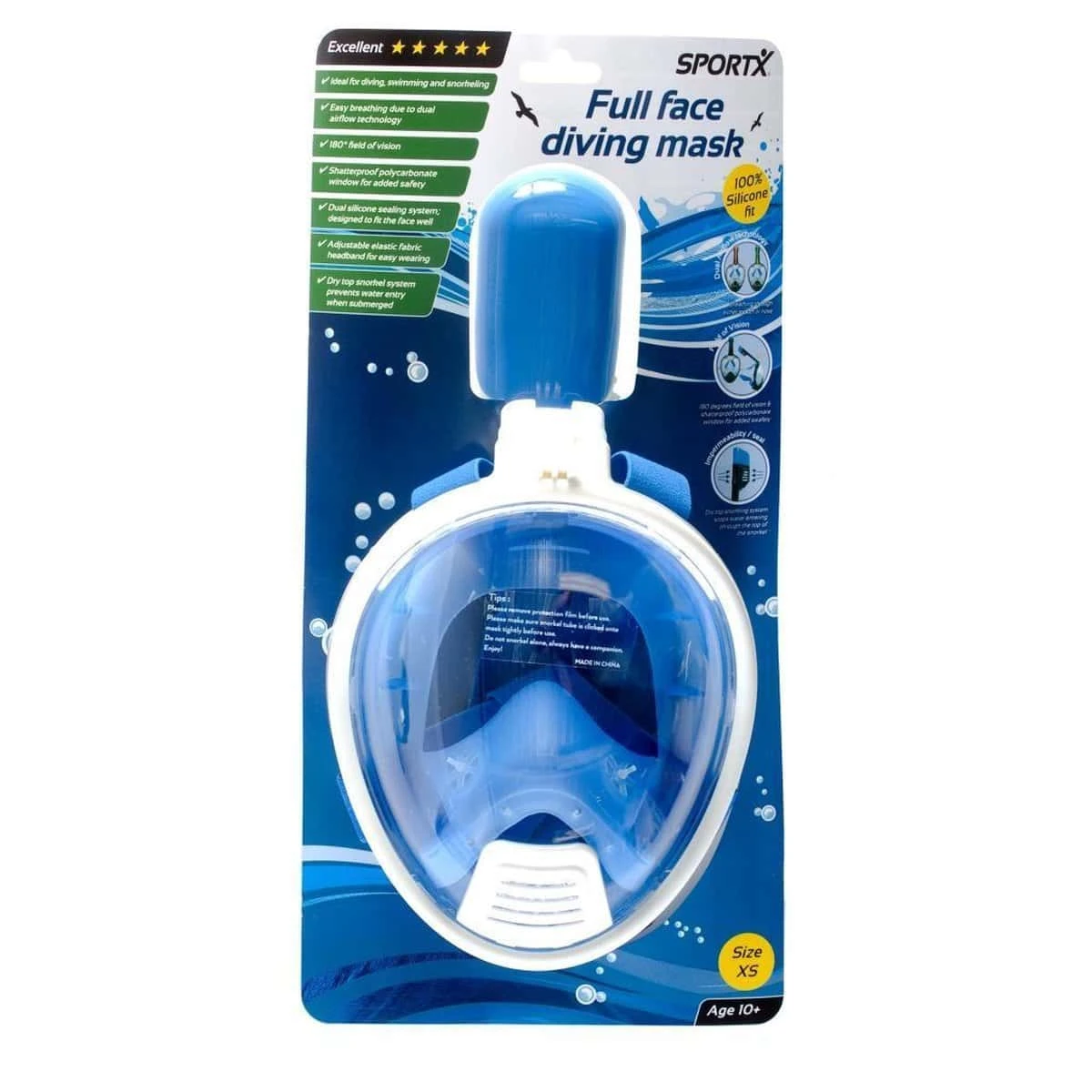 Ontdek de wereld onder water nog gemakkelijker met dit wit met blauwe SportX Full Face snorkel masker: kwaliteit vier sterren, natuurlijk ademen door mond en/of neus, 180° panoramisch gezichtsveld en geen condensatie door inventief luchtcirculatiesysteem. Ideaal voor vakantie, vrije tijd en recreatie! In maat L/XL: geschikt voor volwassenen en mannen (aantal cm afstand tussen de ogen tot de kin: groter dan 12 cm).
