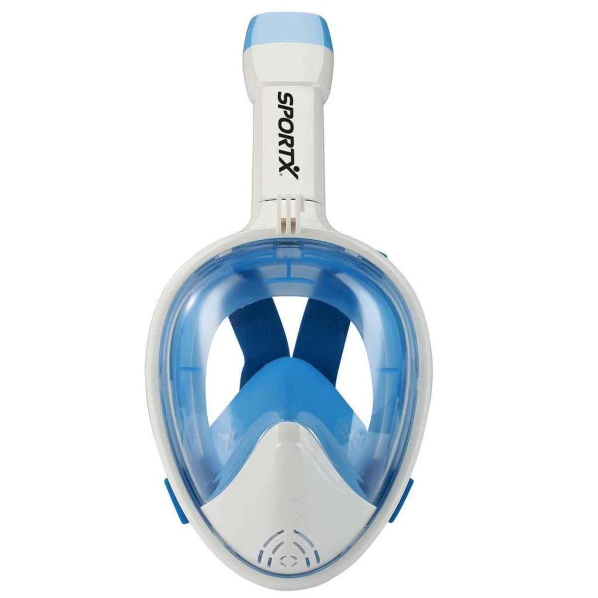 Ontdek de wereld onder water nog gemakkelijker met dit wit met blauwe SportX Full Face snorkel masker, kwaliteit vier sterren, natuurlijk ademen door mond en/of neus, 180° panoramisch gezichtsveld en geen condensatie door inventief luchtcirculatiesysteem. Ideaal voor vakantie, vrije tijd en recreatie! In maat S/M: geschikt voor kinderen vanaf 10 jaar, jongeren en vrouwen (aantal cm afstand tussen de ogen tot de kin: kleiner dan 12 cm).