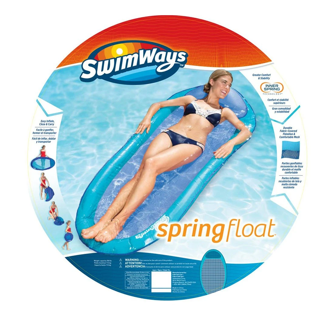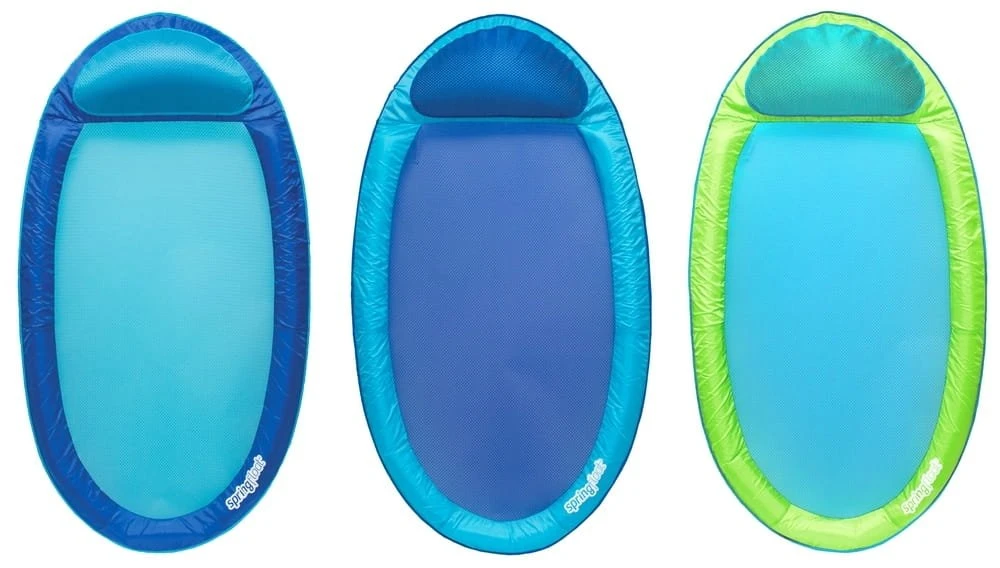 De Spring Float matras is verkrijgbaar in vier kleuren (rood-blauw, blauw-blauw, groen-blauw, oranje-roze) en blijft drijven. Het net houdt u op uw plaats terwijl u net genoeg ondergedompeld bent.